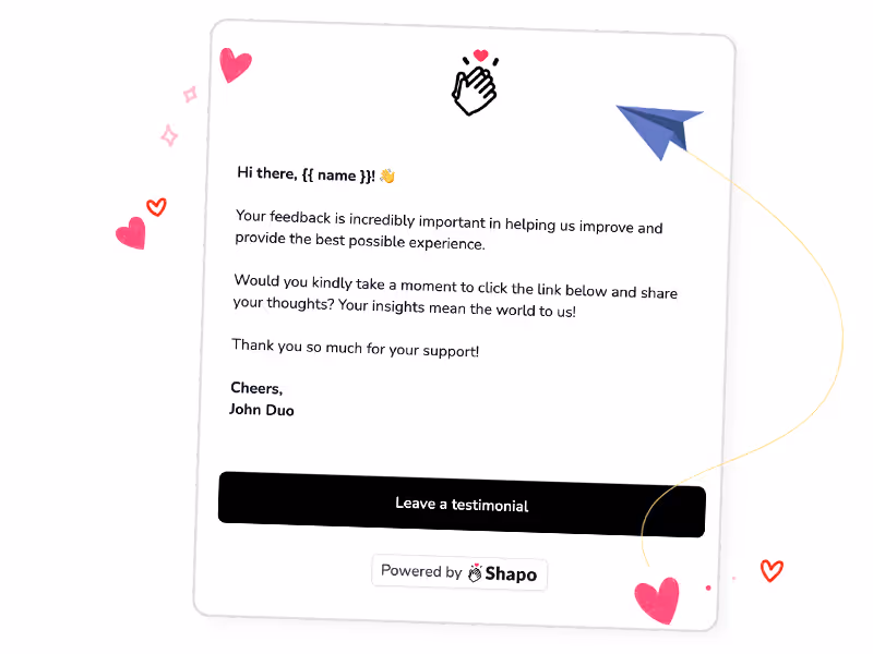Now, you can effortlessly send personalized testimonial requests directly from Shapo, streamlining the process and saving you valuable time in collecting testimonials from your customers.